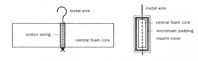Figure 2. left, Method of securing the coat hanger wire to the foam core board with cotton strings.