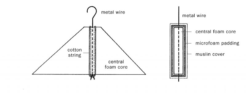 right, cross section of straight-shouldered hanger, showing board, foam padding, muslin