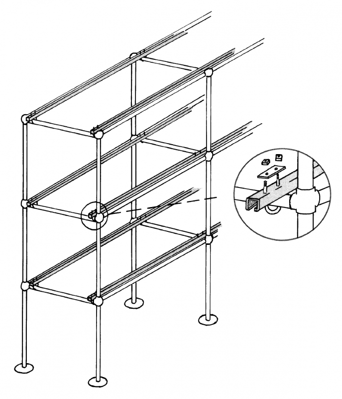 - Attach steel U-shaped channels to the horizontal segments of the racks, parallel to the access aisles between the racks (Fig.1). For each level of hangers that can be accommodated on the rack (this will vary with the height of the rack and the size of the skins), attach a pair of channels, one at the front and one at the back of the rack. The channels are positioned with the open side downward, and attached to the rack with U-bolts (Fig. 1).