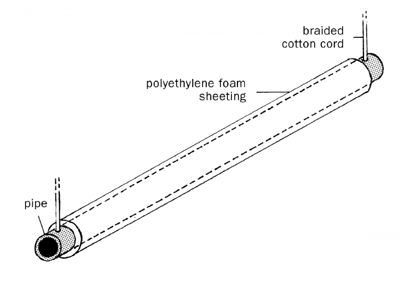 - Wrap each section of plastic pipe with 1/4in expanded polyethylene foam sheeting. The seam should be on the side of the pipe opposite from the drilled holes. The polyethylene foam should cover all of the pipe except the areas at the ends where the holes have been drilled for the cords (Fig. 2).