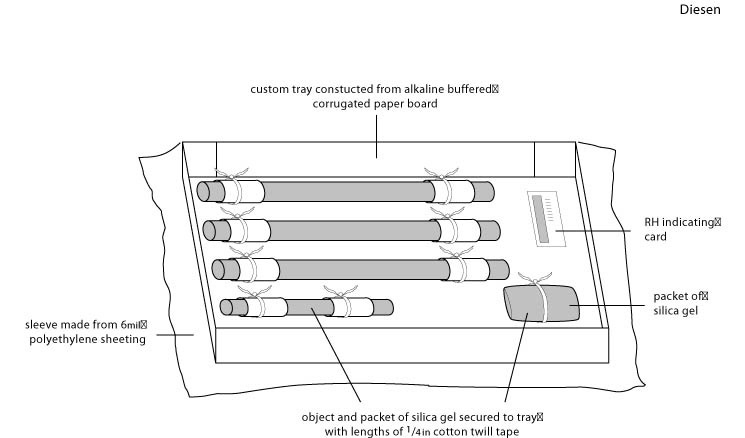 The trays are enclosed in a sleeve made from 6mil polyethylene tubular sheeting which is heat sealed to provide a barrier to reduce the rate of moisture gain and loss. Because the tray is covered with transparent plastic, it is possible to visually inspect the object as well as a relative humidity indicating card (or a small container of indicating silica gel), to monitor the condition of the object and the internal environment of the container.